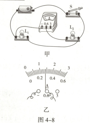 13. (2分)如图4-8甲所示的电路,当开关S闭合后,电流表测量的是通过_(选填“电源”“$L_{1}$”或“$L_{2}$”)的电流,电流表的指针偏转如图乙所示,电流表的示数为_A。