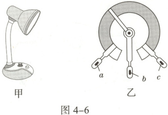 10. 如图4-6所示,甲为可调亮度台灯,乙为台灯中电位器的结构图,b与金属滑片相连,转动旋钮可调节灯泡亮度。下列分析正确的是()