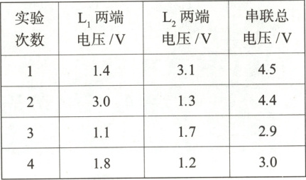 (4)合理,虽然实验数据存在差异,在每一组电源不同的情况下,依照每一组的测量数据仍然可以得出串联电路两端的总电压等于各部分电路两端电压之和的规律