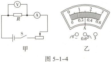 (2)小明按图5-1-4甲连好电路后,闭合开关,移动滑动变阻器的滑片,发现电流表无示数、电压表有示数,其原因可能是(只填序号)。
