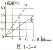 11. 用两个相同的电加热器给质量同为$2kg$的物质甲和水加热,它们的温度随加热时间的变化关系如图1-3-4所示,据此判断甲物质$10min$吸收的热量为()