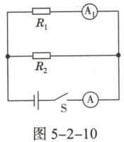 15. 在如图 5 - 2 - 10 所示的电路中,$ R_1 $ 和 $ R_2 $ 为两个定值电阻,其中电阻 $ R_1 = 10 \, \Omega $,电源两端的电压保持不变。开关 $ S $ 闭合后,电流表 $ A $ 示数为 $ 0.5 \, A $,电流表 $ A_1 $ 示数为 $ 0.3 \, A $。求: