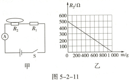 16. 如图 5 - 2 - 11 甲是某电子秤的原理示意图,$ R_1 $ 为定值电阻,托盘下方的电阻 $ R_2 $ 为压敏电阻,其电阻大小与托盘内所放物体质量 $ m $ 大小的关系如图乙所示。已知电源电压为 $ 6 \, V $ 保持不变。