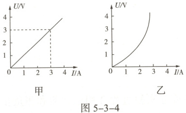 4. 在用“伏安法测电阻”的实验中,有两位同学分别选用定值电阻和小灯泡为测量对象,在处理实验数据时,画出定值电阻和小灯泡的$U-I$图像,分别如图5-3-4甲、乙所示,则对于图像的分析,以下说法错误的是()