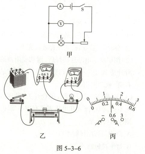 7. 在“测量小灯泡的电阻”实验中,有如下器材:电压表、电流表、开关、电压为$6V$的电源、正常工作时电压为$2.5V$的小灯泡、标有$R_1$“$20\Omega\ 1.5A$”和$R_2$“$10\Omega\ 1A$”的滑动变阻器,导线若干。电路图与实物图如图5-3-6甲、乙所示。