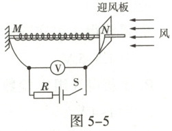 6. 兰兰设计了一种测定风力的装置,其原理如图5 - 5所示,金属迎风板与绝缘轻弹簧的一端N相接,一起套在有一定电阻的光滑金属杆上。电路中左端导线与金属杆的M端相连,右端导线接在迎风板的N点,并可随迎风板在金属杆上滑动,导线与金属杆接触良好。电源两端电压不变,闭合开关,当风力增大时,电压表的示数将()