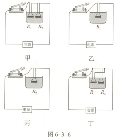 12. 如图6-3-6所示,在四个相同水槽中盛有质量和温度都相同的纯水,现将阻值为R₁、R₂的电阻丝(R₁<R₂),分别按下图的四种方式连接放入水槽,并接入相同电源。通电相同时间后,下列说法正确的是()