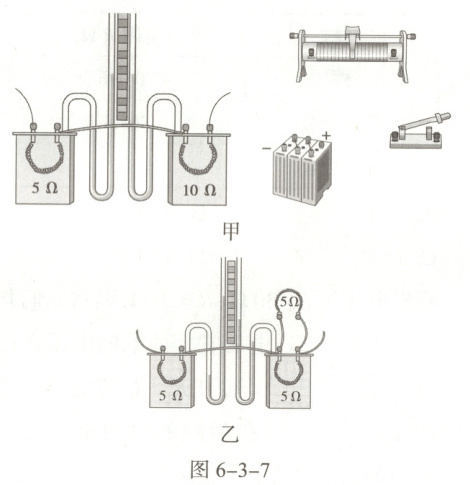 14. 某学习小组在老师的指导下,探究电流通过导体时产生热量的多少跟什么因素有关。他们用的实验器材如图6-3-7所示,两个透明容器中密封着等量空气,U形管中液面最初相平,两个密闭容器中都有一段电阻丝。