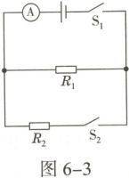 6. 如图6-3,电源电压不变,只闭合开关S₁,电流表的示数为0.4 A,再闭合开关S₂,电流表示数变化了0.3 A,则同时闭合S₁、S₂后,相同时间内,R₁、R₂消耗的电能之比是()