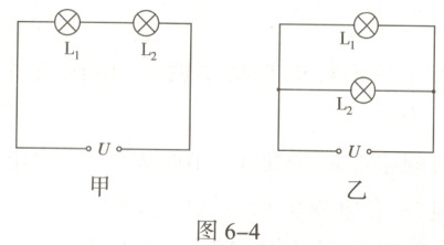 8. 如图6-4所示,将灯L₁、L₂按图甲、乙两种方式接在电压均为U的两个电路中,在甲图中灯L₁的功率为4 W,在乙图中灯L₁的功率为9 W。设灯丝电阻不变。下列说法中不正确的是()