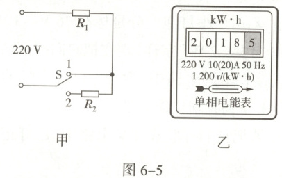 9. 某家用电热壶有“加热”和“保温”两个挡位,其简化电路如图6-5甲所示,电热丝R₁=48.4 Ω,R₂=435.6 Ω。小明为测量该电热壶的实际功率,他把家中的其他用电器都与电源断开,仅让电热壶工作,1 min内电能表(如图乙)的转盘转动了16转。下列说法错误的是()