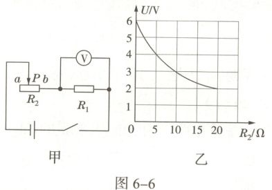 10. 在图6-6甲所示的电路中,当滑片P由b移到a的过程中,电压表示数U及滑动变阻器接入电路的电阻R₂的变化情况如图乙所示。下列说法正确的是()