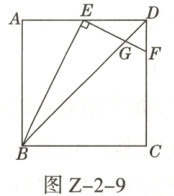 9. 如图 $Z - 2 - 9$,在边长为 $2$ 的正方形 $ABCD$ 中,点 $E$ 是边 $AD$ 的中点,点 $F$ 在边 $CD$ 上,且 $FE \perp BE$,设 $BD$ 与 $EF$ 交于点 $G$,则 $\triangle DEG$ 的面积是______。