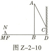 10. 如图 $Z - 2 - 10$ 所示,一电线杆 $AB$ 的影子分别落在地上和墙上。同一时刻,小明竖起 $1m$ 高的直杆 $MN$,量得其影子 $MF$ 长 $0.5m$,量得电线杆 $AB$ 落在地上的影子 $BD$ 长 $3m$,落在墙上的影子 $CD$ 长 $2m$。请你利用小明测量的数据算出电线杆 $AB$ 的高。