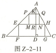 11. 情境题 如图 $Z - 2 - 11$ 所示,有一块锐角三角形卡纸余料 $ABC$,它的边 $BC = 120cm$,高 $AD = 80cm$,为使卡纸余料得到充分利用,现把它裁剪成一个邻边之比为 $2:5$ 的矩形纸片 $EFGH$ 和一个正方形纸片 $PMNQ$,裁剪时,矩形纸片的较长边在 $BC$ 上,正方形纸片一边在矩形纸片的较长边 $EH$ 上,其余顶点均分别在 $AB$,$AC$ 上,具体裁剪方式如图 $Z - 2 - 11$ 所示。