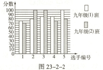 16. 某校开展唱歌比赛活动,九年级(1)(2)班根据初赛成绩,各选出$5$名选手参加复赛,两个班各选出的$5$名选手的复赛成绩如图$23 - 2 - 2$所示。