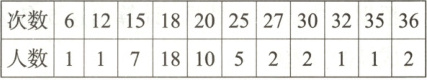 (1)该组数据的平均数$=\frac{1}{50}×(6×1+12×1+15×7+18×18+20×10+25×5+27×2+30×2+32×1+35×1+36×2)=20.5;$众数为18;中位数为18。