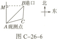 10. 如图C-26-6所示,已知$B$港口位于$A$观测点北偏东$45^{\circ}$方向,且其到$A$观测点正北方向的距离$BM$的长为$10\sqrt{2}\ \mathrm{km}$,一艘货轮从$B$港口沿$BC$方向航行$4\sqrt{7}\ \mathrm{km}$到达$C$处,测得$C$处位于$A$观测点北偏东$75^{\circ}$方向,则此时货轮与$A$观测点之间的距离$AC$的长为( )