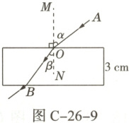 15. 物理学告诉我们,当光从空气斜射入介质时会发生折射,其中入射角的正弦值和折射角的正弦值之比叫做这种介质的折射率。如图C-26-9,入射光线$AO$在点$O$处斜射入某一高度为$3\ \mathrm{cm}$,折射率为$\frac{4}{3}$的长方体介质(其中$\alpha$为入射角,$\beta$为折射角,$MN$过点$O$且垂直于介质的上表面),若$\alpha = 53^{\circ}$,则折射光线在该介质中传播的距离(即$OB$的长度)约是______$\mathrm{cm}$。(参考数据:$\sin 53^{\circ} \approx 0.80$,$\cos 53^{\circ} \approx 0.60$,$\tan 53^{\circ} \approx 1.33$)