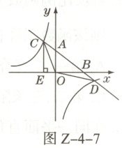 14. 如图 Z - 4 - 7 所示,一次函数$y = ax + b$的图像与反比例函数$y=\frac{k}{x}$的图像交于$C$,$D$两点,与$x$,$y$轴交于$B$,$A$两点,且$\tan\angle ABO=\frac{1}{2}$,$OB = 4$,$OE = 2$。