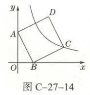 24. 探究性试题(12分)如图C-27-14,四边形ABCD为正方形,点A在y轴上,点B在x轴上,且 $ OA = 4 $,$ OB = 2 $,反比例函数 $ y = \frac{k}{x}(k \neq 0) $ 在第一象限的图像经过正方形的顶点C。