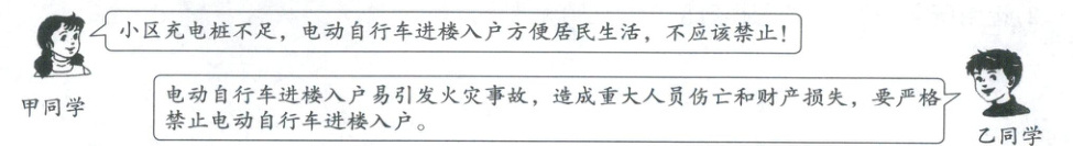 某社区居委会组织居民代表参与“民生议事堂”议事活动,商讨“禁止电动自行车进楼入户”事项。对此,甲、乙两位同学有不同的看法。