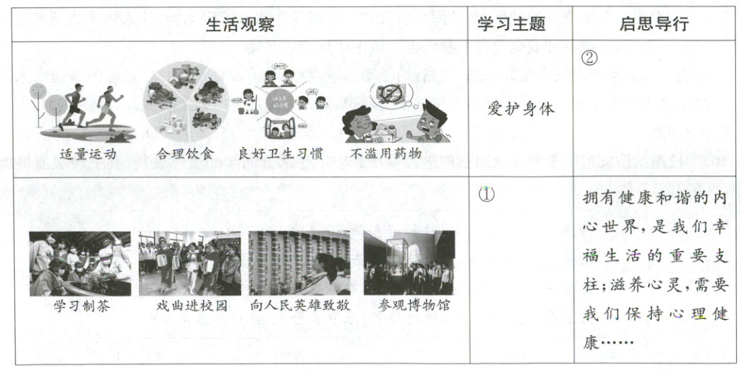 (3)保持身心健康是提高生命质量的关键,只有拥有强健的体魄、健康的身心和丰富的精神世界,才能看到生命中更多的希望和光彩。请你结合“生活观察”,完成下列表格。(6分)