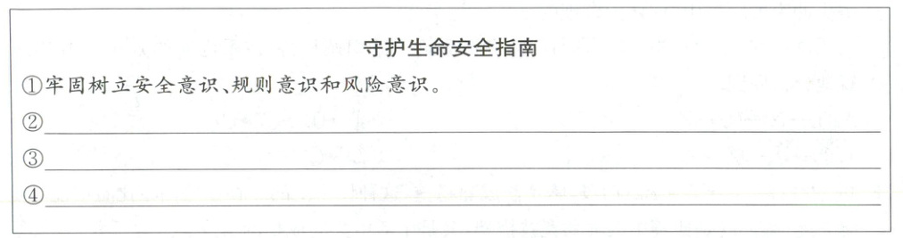 (2)生命安全是我们创造和享受一切美好的前提。在日常生活中,突如其来的灾难、事故可能会危害人的生存、健康和幸福,甚至会毁灭鲜活的生命。为增强安全意识,提高防护能力,同学们制作了守护生命安全指南,请你补充完整。(6分)