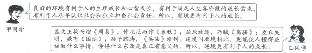 某校七年级(3)班学习小组召开以“生命中的顺境和逆境”为主题的辩论会。下面是两位同学不同的看法。
