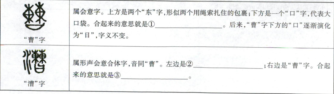 2 (3分)①大口袋里装着很多东西 ②“水”字,形似一条河流 ③通过水道或河道运送东西(每空1分。意思对即可)