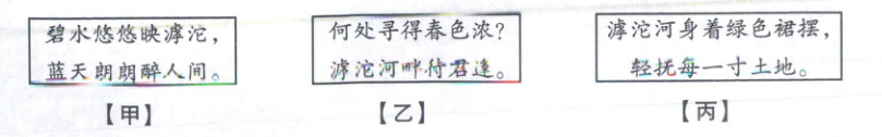 (2)(2分)【甲】示例:运用对偶,句式整齐,富有音韵美,既描绘了滹沱河的自然美景,又点明了这种美景带给人的感受。 【乙】示例:采用设问句,引起读者的思考,既描绘了滹沱河春色的浓郁,又表达了期待游客到来的心情,起到了很好的宣传效果。 【丙】示例:运用拟人的修辞手法,描绘出滹沱河的生机盎然,形象生动地表现了滹沱河的温柔和对土地的滋养。(赏析角度1分,理由1分,意思对即可)