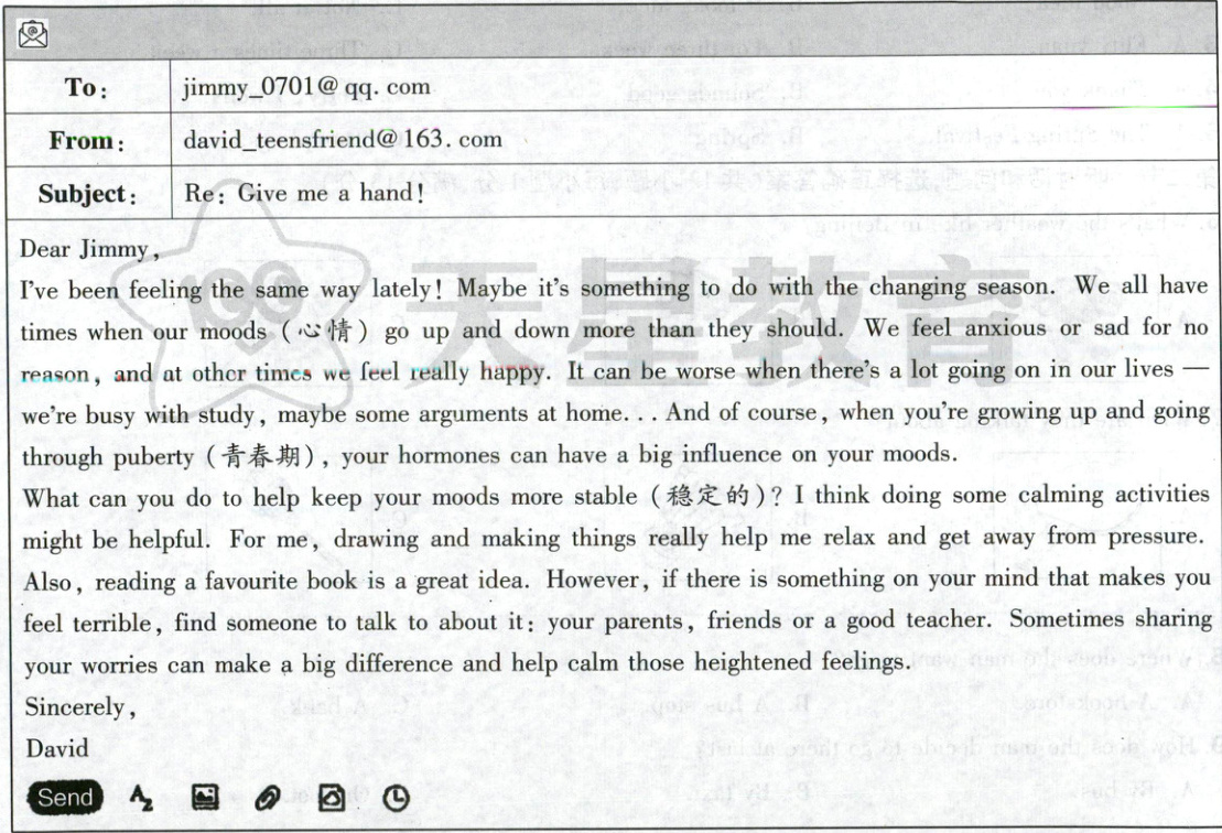 【阅读 A 篇短文大意】 本文是一封戴维回复吉米的信件,信中戴维提到自己也感受到情绪波动,并建议吉米通过一些放松的活动来保持情绪稳定,同时鼓励他与他人分享自己的担忧。