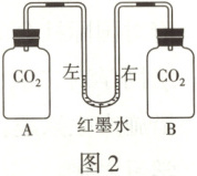 (5)为了验证二氧化碳能与氢氧化钠溶液发生化学反应,设计实验,装置如图 2 所示:A、B 瓶中装有等体积的二氧化碳气体,装置气密性良好,实验开始前红墨水左右两端液面相平。实验时同时向 A、B 瓶中分别加入等体积的氢氧化钠溶液和蒸馏水,塞紧瓶塞、振荡、平放,实验结束红墨水液面呈现