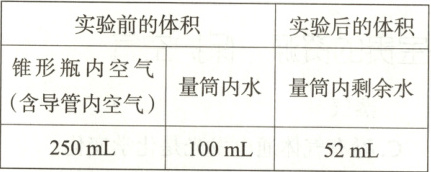 13. 兴趣小组同学利用暖宝宝贴(主要成分为铁粉、氯化钠、水等)测定空气中氧气含量。按如图组装装置并检查装置气密性,一段时间后打开止水夹,水倒吸入锥形瓶,测得实验数据如表。下列关于实验的分析不合理的是(