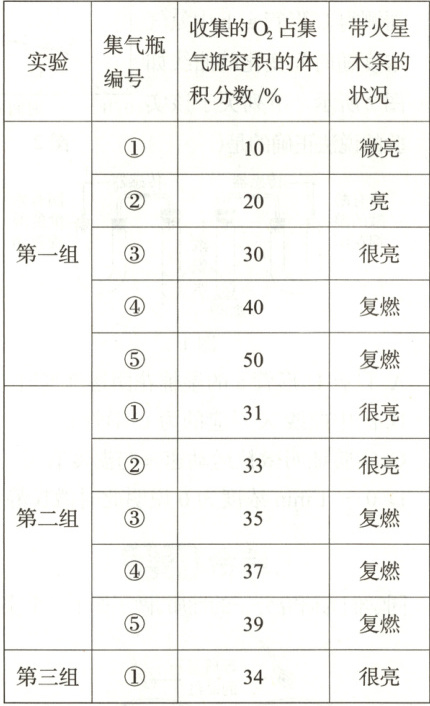 (2)由题表数据可知,当收集到的氧气的体积分数达到35%时,带火星的木条复燃,此时空气还占65%,空气中含有氧气的量为65%×20%=13%,所以此时集气瓶内氧气的总体积分数为13%+35%=48%。