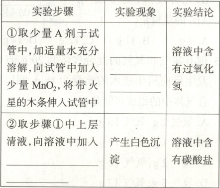 先将一包 A 剂放入一个洁净的烧杯中,加水至完全溶解,观察到无气泡产生;向溶液中放入一包 B 剂,立即有大量气泡产生。待反应结束后,将烧杯中剩余固体过滤、洗涤、干燥,称得固体质量为 3g。某同学认为 B 剂起催化作用。