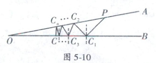 13.2° 解:如图5 - 10所示,CₙC₁⊥OB,∠AOB = 11°,∠OC₁C = 90° - 11° = 79°。根据反射定律易知∠Cₙ₋₂CₙCₙ₋₁ = ∠OC₁C = 79°,