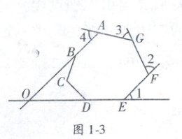 12. (2024·长沙市雅礼教育集团创新拔尖选拔赛) 如图 1 - 3, 七边形 $ ABCDEFG $ 中, $ AB,ED $ 的延长线交于点 $ O $, 外角 $ \angle 1,\angle 2,\angle 3,\angle 4 $ 的和等于 $ 220^{\circ} $, 则 $ \angle BOD $ 的度数是