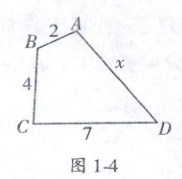 13. (2023 - 2024 学年合肥五十中培优选拔) 如图 1 - 4, $ ABCD $ 是凸四边形, 则 $ x $ 的取值范围是