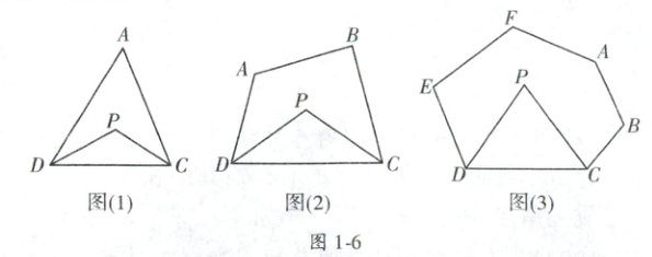 ∴∠DPC=180°−∠PDC−∠PCD=180°−$\frac{1}{2}$∠ADC−$\frac{1}{2}$∠ACD=180°−$\frac{1}{2}$(∠ADC+∠ACD)=180°−$\frac{1}{2}$(180°−∠A)=90°+$\frac{1}{2}$∠A;探究二:由探究一知∠DPC=180°−$\frac{1}{2}$(∠ADC+∠BCD)=180°−$\frac{1}{2}$(360°−∠A−∠B)=$\frac{1}{2}$(∠A+∠B);探究三:六边形ABCDEF的内角和为(6−2)·180°=720°,同理∠DPC=180°−$\frac{1}{2}$(∠EDC+∠ACD)=180°−$\frac{1}{2}$(720°−∠A−∠B−∠E−∠F)=$\frac{1}{2}$(∠A+∠B+∠E+∠F)−180°,即∠P=$\frac{1}{2}$(∠A+∠B+∠E+∠F)−180°.