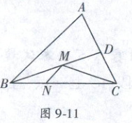 12. (湖北黄冈中学自主招生)如图 9 - 11,在锐角三角形 $ ABC $ 中,$ AB = 8 $,$ \triangle ABC $ 的面积为 40,$ BD $ 平分 $ \angle ABC $,若 $ M,N $ 分别是 $ BD,BC $ 上的动点,则 $ CM + MN $ 的最小值为