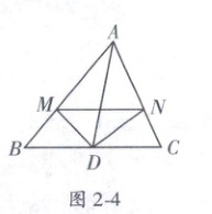 5. (湛江市霞山区自主招生)如图 2 - 4,在 $ \triangle ABC $ 中,$ AD $ 为 $ BC $ 边上中线,$ DM,DN $ 分别是 $ \angle ADB,\angle ADC $ 的角平分线,试比较 $ BM + CN $ 与 $ MN $ 的大小关系 (