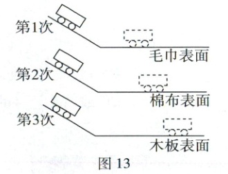 (1) 在探究“阻力对物体运动的影响”的三次实验中,小车从同一斜面的同一高度由静止滑下,小车最终静止时的位置如图13所示。由三次实验可以看出,水平面越光滑,小车受到的阻力越小,小车滑行的距离就越远,速度减小得越慢。由此进一步推理:若运动的小车不受阻力,则小车将