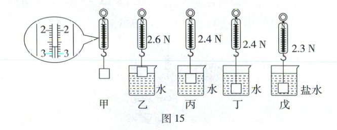 17. (6分)如图15所示是小明同学所在的实验小组探究“浮力大小与哪些因素有关”的实验装置。(已知水的密度为1.0×10³kg/m³,g取10N/kg)