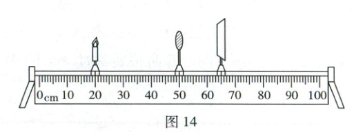 ② 他先将f=5cm的凸透镜固定在光具座上50cm刻度处,再将点燃的蜡烛放在光具座上20cm刻度处,光屏的初始位置如图14所示,此时向