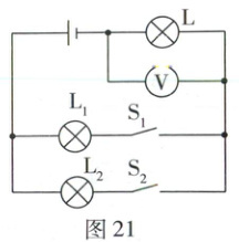 【拓展】灯泡L₁和L₂的额定功率相等,额定电流分别为0.2A和0.3A,小明利用图18中的灯泡L,对L₁和L₂的发光情况进行研究。将L、L₁、L₂与某一可调压电源连接成图21所示的电路,只闭合S₁,调节电源电压至某一值时,通过电压表判断出L₁正常发光;断开S₁,闭合S₂,发现不用改变电源电压,L₂也恰好正常发光。则L₁正常发光时的电阻为