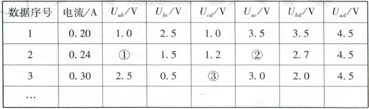 (2)连接好电路后,闭合开关,移动滑动变阻器的滑片至某一位置,记录电流表的示数;选择合适的测量范围,用电压表分别测出ab、bc、cd、ac、bd、ad间的电压。将这些数据记人下表。改变滑动变阻器滑片的位置,在保证电路安全的情况下再做几次实验。读取数据①时电压表的示数如图20所示,示数为