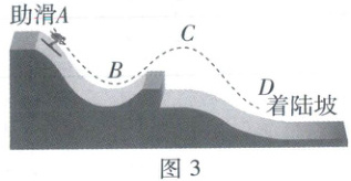 6. 2025年2月12日,在哈尔滨亚冬会自由式滑雪女子大跳台决赛中,中国队包揽了金银铜牌。如图3是运动员比赛过程的运动轨迹简化图,忽略空气阻力,下列相关说法正确的是 (