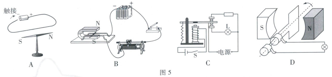 7. 如图4是一款不用电池就能工作的无线遥控开关,开关中有一个固定的线圈和一个可以移动的小磁铁,按压开关即可带动小磁铁在线圈内运动并产生电流,给开关内的发射器提供电能。图5中的装置与无线遥控开关的工作原理相同的是 (