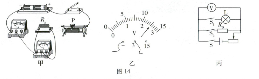 (1)请用笔画线代替导线,将图14甲中的实物电路连接完整(要求:滑片P向右移动时滑动变阻器接入电路的阻值变小)。